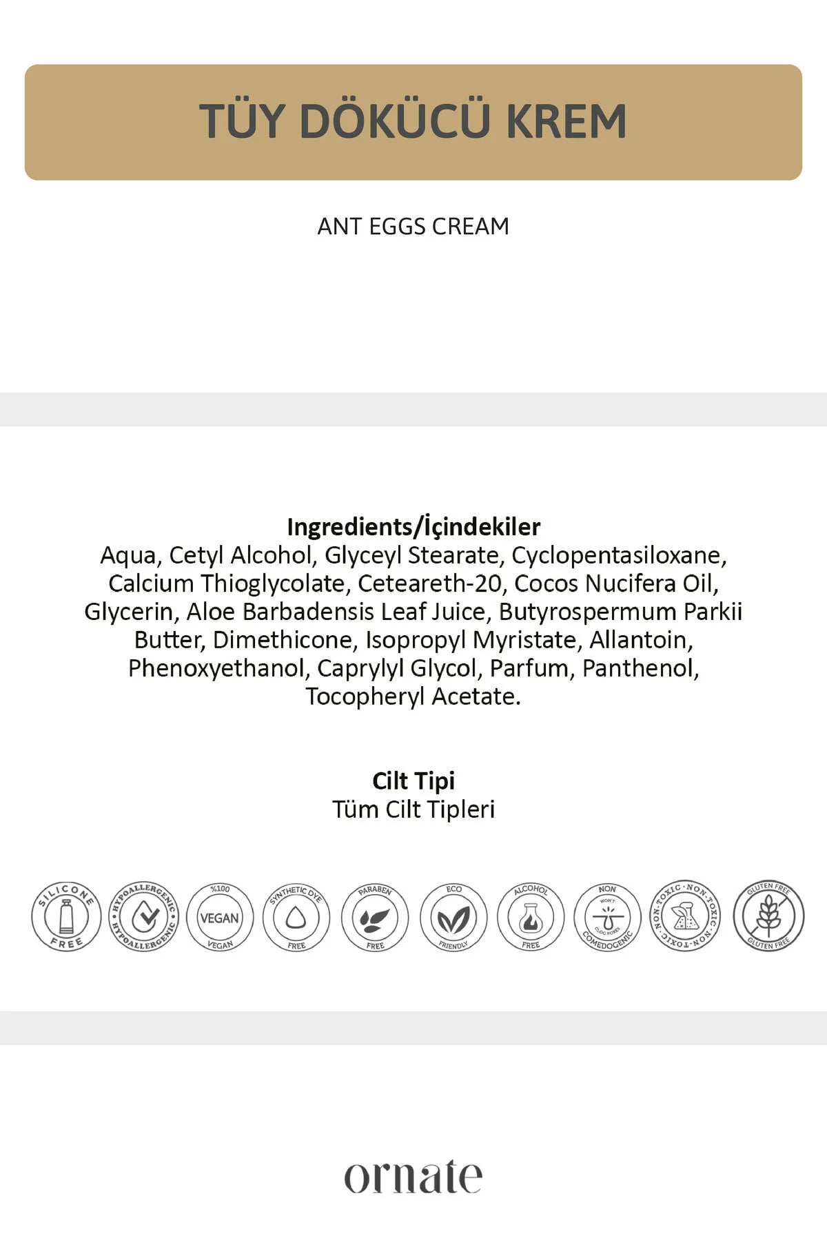 Dankzij het mierenei-extract en de olie in de miereneicrème helpt het om ongewenst haar permanent en pijnloos te verwijderen. Het ondersteunt het verkrijgen van een vlekkeloze huid en voorkomt nieuwe haarvorming. Het is een pijnloze en pijnloze procedure.